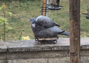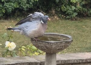 Since Monday, it’s hardly stopped raining. I don’t mind. We need it, we really do. And so do all the animals and birds in our garden. But yesterday, it proper banged it down. Biblical, it was. And there was a single solitary stupid wood pigeon just standing in it, lifting its wings to wash under its arms, only hunkering down when it was almost like hail. It got absolutely drenched. But at least it was happy. The pictures aren’t great, but they give the idea.